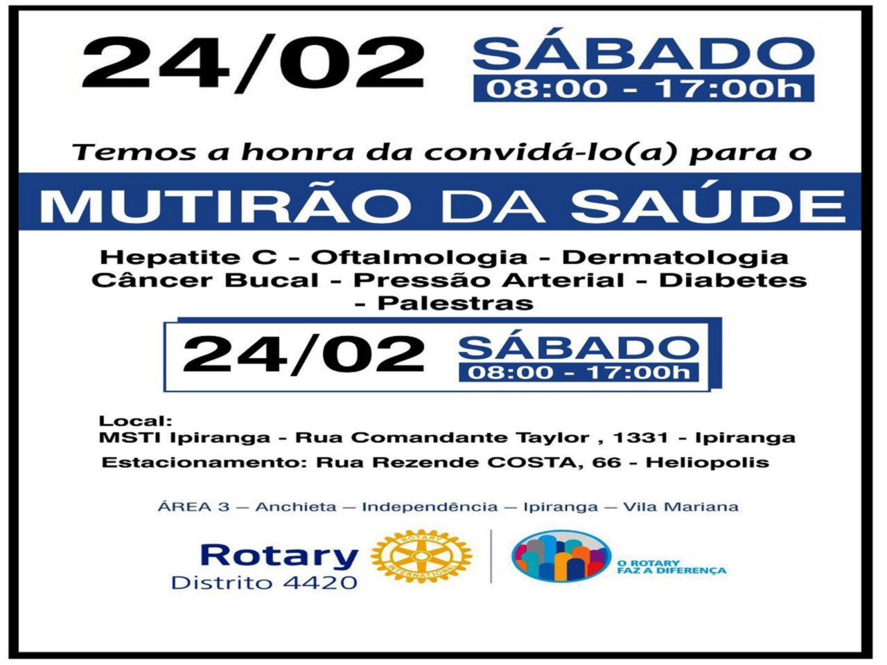 No dia 24 de fevereiro, o Distrito 4420, em parceria com os quatro Rotary Clubs da área 3, realizou o Mutirão da Saúde, em celebração ao Dia do Rotary, que completou 113 anos de sua fundação. O evento aconteceu no MSTI Ipiranga, localizado na Rua Comandante Taylor, 1331, Heliópolis, em São Paulo.