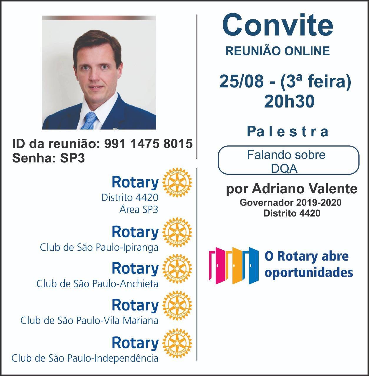 Os Clubes da Área SP3 convidam você para participar de uma Reunião Virtual com nosso Palestrante Adriano Valente EGD 2019/2020 - "Falando sobre DQA" - não percam - dia 25/08/2020 - Terça-feira - às 20h30